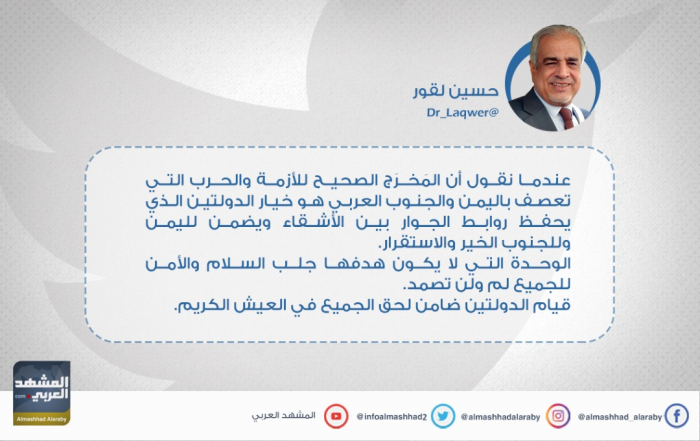 وقال في تغريدة عبر "تويتر" رصدها "المشهد العربي": "عندما نقول أن المخرج الصحيح للأزمة والحرب التي تعصف باليمن والجنوب العربي هو خيار الدولتين الذي يحفظ روابط الجوار بين الأشقاء ويضمن لليمن وللجنوب الخير والاستقرار".