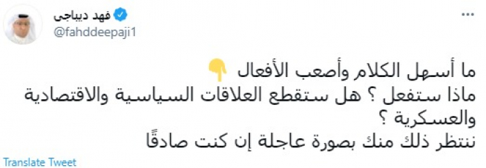 وقال في تغريدة عبر "تويتر" رصدها "المشهد العربي": "ما أسهل الكلام وأصعب الأفعال ماذا ستفعل ؟ هل ستقطع العلاقات السياسية والاقتصادية والعسكرية ؟ ننتظر ذلك منك بصورة عاجلة إن كنت صادقًا".