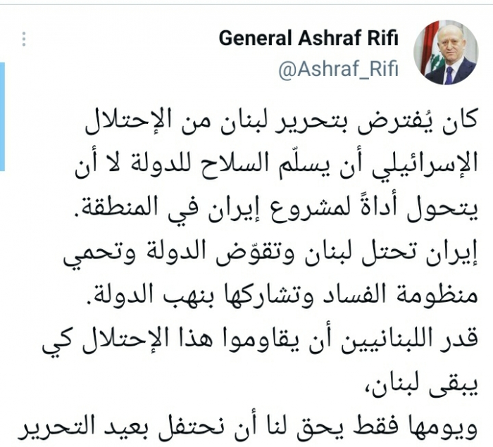 وأكد في تغريدة على حسابه بموقع التدوين المصغر تويتر، اليوم أنه: " كان يُفترض بتحرير لبنان من الاحتلال الإسرائيلي أن يسلّم السلاح للدولة لا أن يتحول أداةً لمشروع إيران في المنطقة".