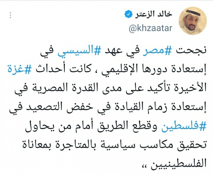 وقال في تغريدة على حسابه بموقع التدوين المصغر تويتر، اليوم إنه: "نجحت مصر في عهد السيسي في استعادة دورها الإقليمي".