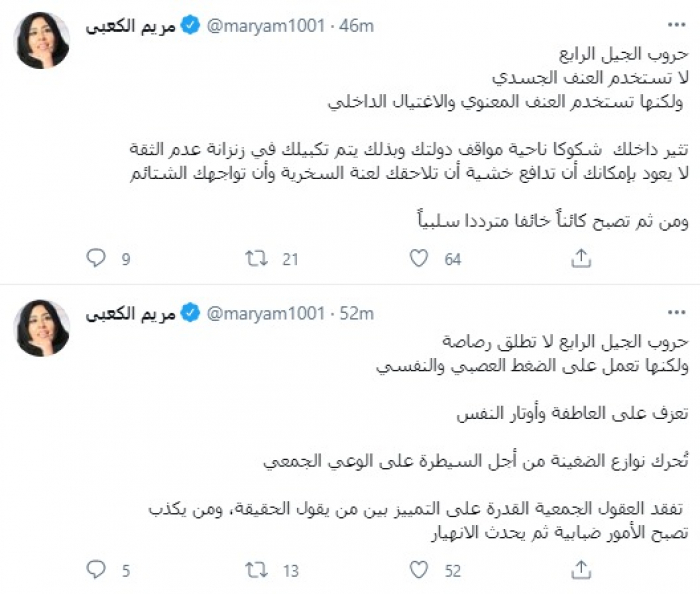 كشفت الإعلامية الإماراتية مريم الكعبي، اليوم، الأدوات المستخدمة في حروب الجيل الرابع.