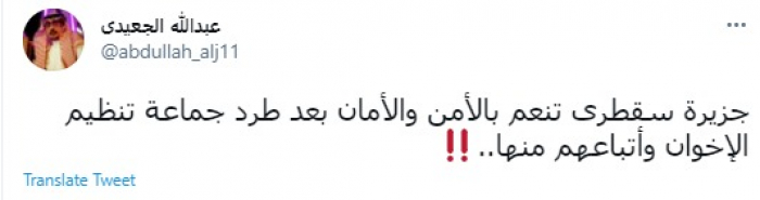 وقال في تغريدة عبر "تويتر" رصدها "المشهد العربي": "جزيرة سقطرى تنعم بالأمن والأمان بعد طرد جماعة تنظيم الإخوان وأتباعهم منها".
