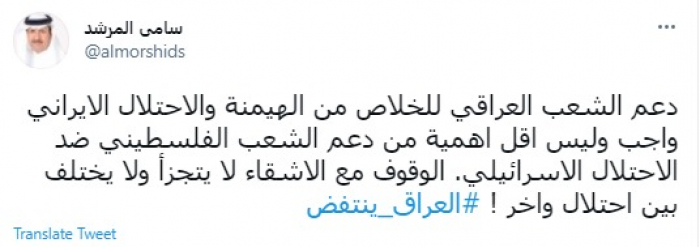 وقال في تغريدة عبر "تويتر" رصدها "المشهد العربي": "دعم الشعب العراقي للخلاص من الهيمنة والاحتلال الإيراني واجب وليس أقل أهمية من دعم الشعب الفلسطيني ضد الاحتلال الإسرائيلي".