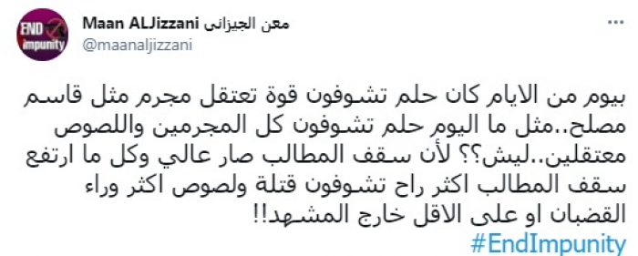 وقال في تغريدة عبر "تويتر" رصدها "المشهد العربي": "بيوم من الايام كان حلم تشوفون قوة تعتقل مجرم مثل قاسم مصلح..مثل ما اليوم حلم تشوفون كل المجرمين واللصوص معتقلين..ليش؟؟ لأن سقف المطالب صار عالي وكل ما ارتفع سقف المطالب اكثر راح تشوفون قتلة ولصوص اكثر وراء القضبان او على الاقل خارج المشهد".