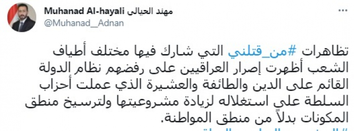 وكتب في تغريدة عبر "تويتر" رصدها "المشهد العربي": "تظاهرات من قتلني التي شارك فيها مختلف أطياف الشعب أظهرت إصرار العراقيين على رفضهم نظام الدولة القائم على الدين والطائفة والعشيرة الذي عملت أحزاب السلطة على استغلاله لزيادة مشروعيتها ولترسيخ منطق المكونات بدلاً من منطق المواطنة".