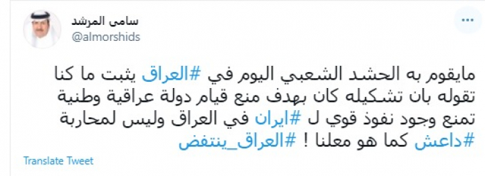 وقال في تغريدة عبر "تويتر" رصدها "المشهد العربي": "ما يقوم به الحشد الشعبي اليوم في العراق يثبت ما كنا تقوله بان تشكيله كان بهدف منع قيام دولة عراقية وطنية تمنع وجود نفوذ قوي لإيران في العراق وليس لمحاربة داعش كما هو معلنا.. العراق ينتفض".