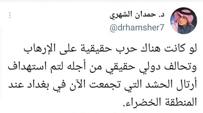 وأوضح في تغريدة على حسابه بموقع التدوين المصغر تويتر، اليوم أنه: "لو كانت هناك حرب حقيقية على الإرهاب وتحالف دولي حقيقي من أجله لتم استهداف أرتال الحشد التي تجمعت الآن في بغداد عند المنطقة الخضراء".