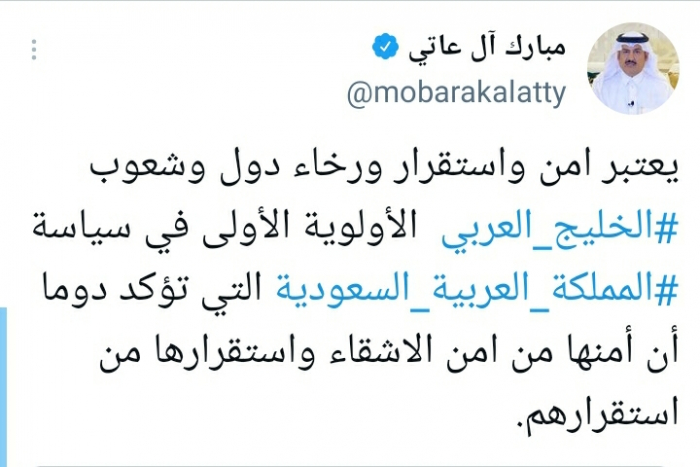 آل عاتي: رخاء واستقرار الخليج العربي أولوية للسعودية
