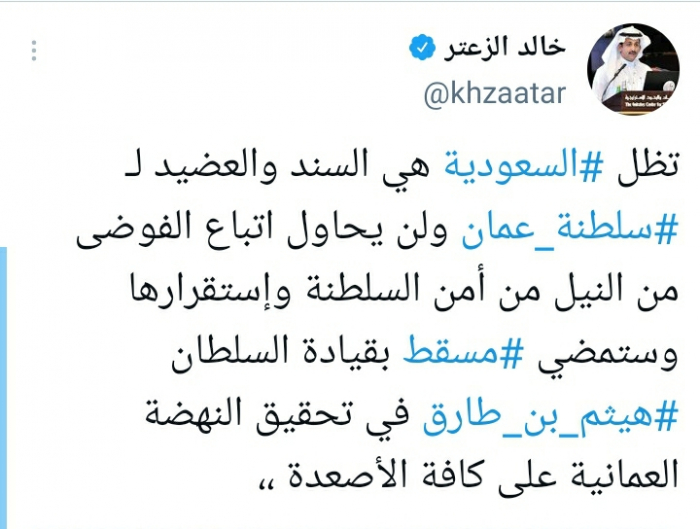واعتبر في تغريدة على حسابه بموقع التدوين المصغر تويتر، اليوم أنه: "تظل السعودية هي السند والعضيد لسلطنة عمان".