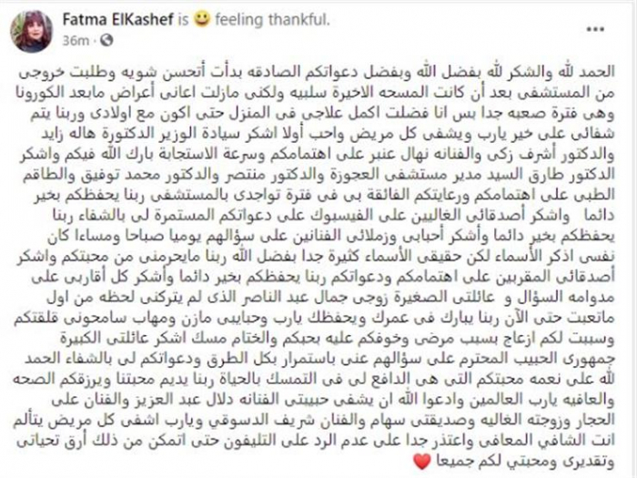 وكتبت "فاطمة" عبر حسابها على فيسبوك: "الحمد لله والشكر لله، بفضل الله وبفضل دعواتكم الصادقة، بدأت أتحسن شوية وطلبت خروجي من المستشفى بعد أن كانت المسحة الأخيرة سلبية، ولكني ما زلت أعاني أعراض ما بعد كورونا، وهي فترة صعبة جدًا بس أنا فضلت أكمل علاجي في المنزل حتى أكون مع أولادي وربنا يتم شفائي على خير يا رب ويشفي كل مريض".