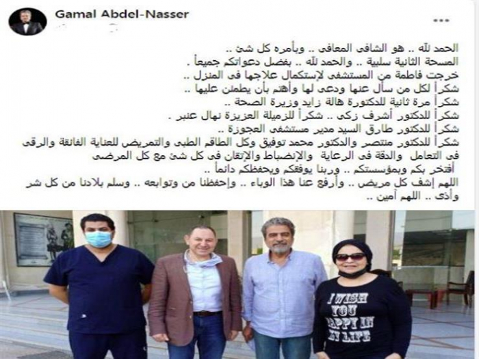 وتابع: "شكرًا لكل من سأل عنها ودعى لها واهتم بأن يطمئن عليها.. شكرًا مرة ثانية للدكتورة هالة زايد وزيرة الصحة.. شكرا للدكتور أشرف زكي.. شكرا للزميلة العزيزة نهال عنبر.. شكرًا للدكتور طارق السيد مدير مستشفى العجوزة.. شكرا للدكتور منتصر والدكتور محمد توفيق وكل الطاقم الطبي والتمريض للعناية الفائقة والرقي في التعامل والدقة في الرعاية والانضباط والإتقان في كل شىء مع كل المرضى".
