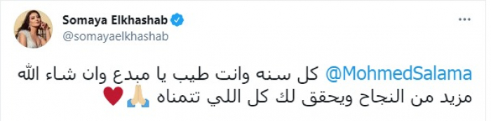 وكتبت الخشاب، عبر حسابها على تويتر: "كل سنة وأنت طيب يا مبدع، وإن شاء الله مزيد من النجاح ويحقق لك كل اللي تتمناه".