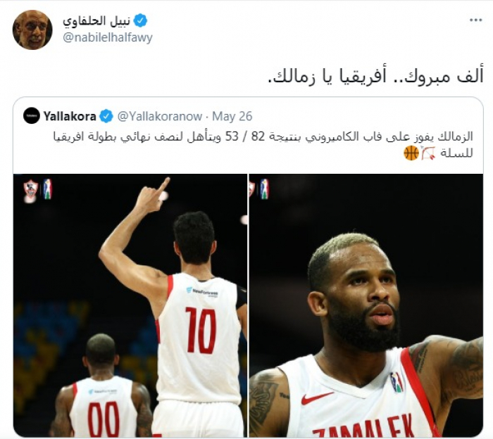 حرص الفنان المصري القدير نبيل الحلفاوي، على تهنئة فريق نادي الزمالك لكرة السلة بعد تأهله لنصف نهائي إفريقيا.