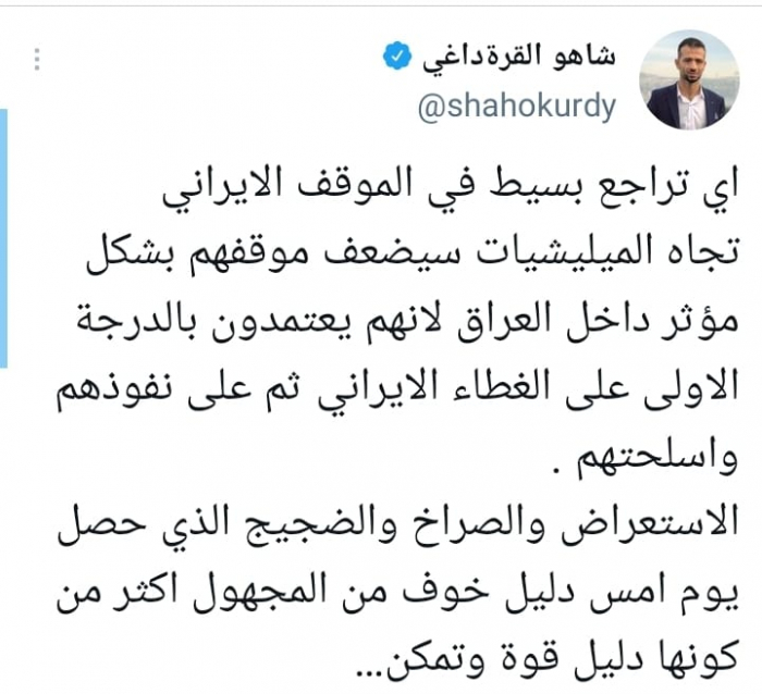 وشدد في تغريدة على حسابه بموقع التدوين المصغر تويتر، اليوم على أن: "أي تراجع بسيط في الموقف الإيراني تجاه الميليشيات سيضعف موقفهم بشكل مؤثر داخل العراق لأنهم يعتمدون بالدرجة الأولى على الغطاء الإيراني ثم على نفوذهم وأسلحتهم".