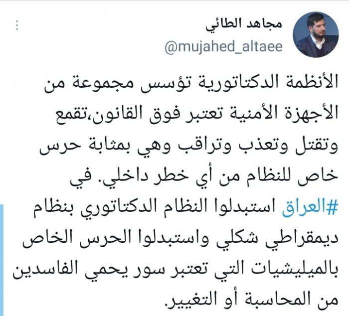 وأوضح في تغريدة على حسابه بموقع التدوين المصغر تويتر، اليوم أن: "الأنظمة الدكتاتورية تؤسس مجموعة من الأجهزة الأمنية تعتبر فوق القانون، تقمع وتقتل وتعذب وتراقب وهي بمثابة حرس خاص للنظام من أي خطر داخلي".