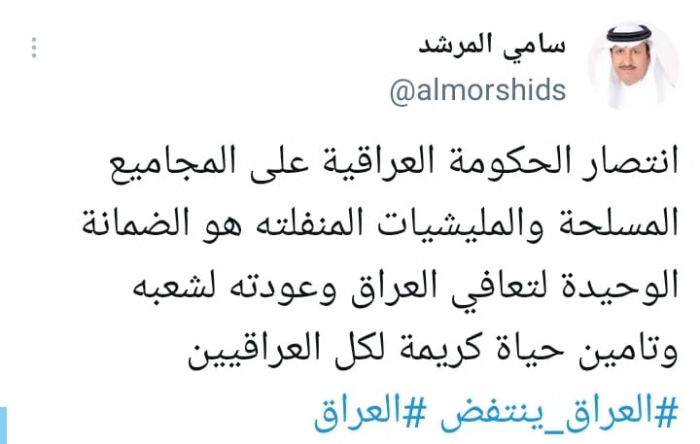 وشدد في تغريدة على حسابه بموقع التدوين المصغر تويتر، اليوم على أن: "انتصار الحكومة العراقية على المجاميع المسلحة والمليشيات المنفلتة هو الضمانة الوحيدة لتعافي العراق وعودته لشعبه وتأمين حياة كريمة لكل العراقيين"، مختتما: "العراق ينتفض".