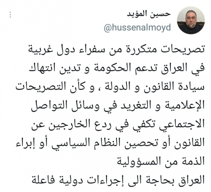 وشدد في تغريدة على حسابه بموقع التدوين المصغر تويتر، اليوم على أن هناك: "تصريحات متكررة من سفراء دول غربية في العراق تدعم الحكومة وتدين انتهاك سيادة القانون و الدولة".