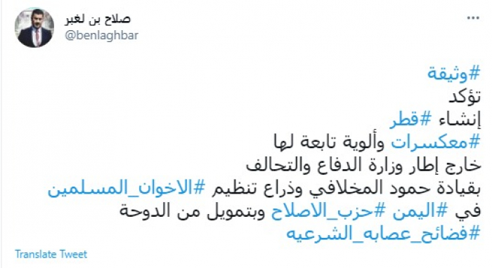 وقال في تغريدة عبر "تويتر" رصدها "المشهد العربي": "وثيقة.. تؤكد إنشاء قطر معسكرات وألوية تابعة لها خارج إطار وزارة الدفاع والتحالف بقيادة حمود المخلافي وذراع تنظيم الإخوان المسلمين في اليمن حزب الإصلاح وبتمويل من الدوحة".