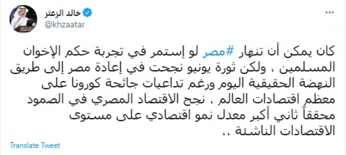 وقال في تغريدة عبر "تويتر" رصدها "المشهد العربي": "كان يمكن أن تنهار مصر لو إستمر في تجربة حكم الإخوان المسلمين ، ولكن ثورة يونيو نجحت في إعادة مصر إلى طريق النهضة الحقيقية".