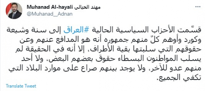وقال في تغريدة عبر "تويتر" رصدها "المشهد العربي": "قسَّمت الأحزاب السياسية الحالية العراق إلى سنة وشيعة وكورد وأوهم كلٌ منهم جمهوره أنه هو المدافع عنهم وعن حقوقهم التي سلبتها بقية الأطراف، إلا أنه في الحقيقة لم يسلب المواطنون البسطاء حقوق بعضهم البعض، ولا أحد منهم عدو للآخر، ولا يوجد بينهم صراع على موارد البلاد التي تكفي الجميع".