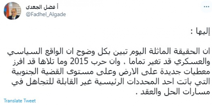 وكتب في تغريدة عبر "تويتر" رصدها "المشهد العربي": "إن الحقيقة الماثلة اليوم تبين بكل وضوح أن الواقع السياسي والعسكري قد تغير تمامًا، وأن حرب 2015 وما تلاها قد أفرز معطيات جديدة على الأرض".