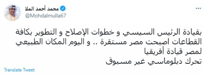 وقال في تغريدة عبر "تويتر" رصدها "المشهد العربي": "بقيادة الرئيس السيسي وخطوات الإصلاح والتطوير بكافة القطاعات أصبحت مصر مستقرة.. واليوم المكان الطبيعي لمصر قيادة أفريقيا.. تحرك دبلوماسي غير مسبوق".