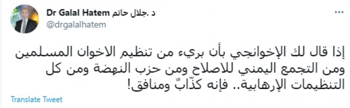وكتب في تغريدة عبر "تويتر" رصدها "المشهد العربي": "إذا قال لك الإخوانجي بأن بريء من تنظيم الإخوان المسلمين ومن التجمع اليمني للإصلاح ومن حزب النهضة ومن كل التنظيمات الإرهابية.. فإنه كذّاب ومنافق".