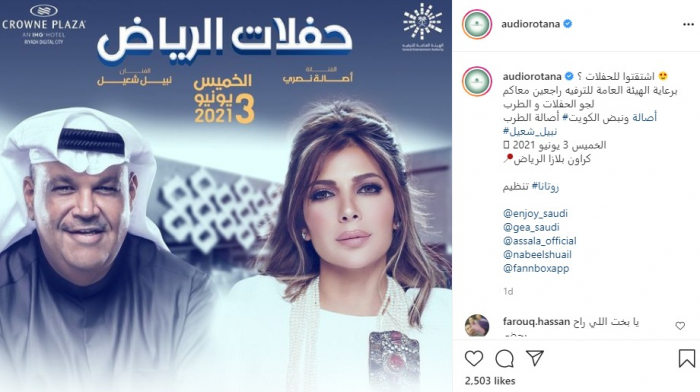 أعلن حساب "روتانا أوديو"، عن عودة حفلات الرياض واختيار الفنانة السورية أصالة والمطرب نبيل شعيل لإحياء أولى حفلات موسم الرياض، على أن يكون الحفل يوم الخميس 3 يونيو.
