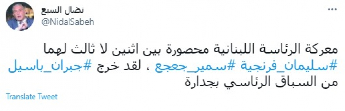 وقال في تغريدة عبر "تويتر" رصدها "المشهد العربي": "معركة الرئاسة اللبنانية محصورة بين اثنين لا ثالث لهما سليمان فرنجية سمير جعجع ، لقد خرج جبران باسيل من السباق الرئاسي بجدارة".
