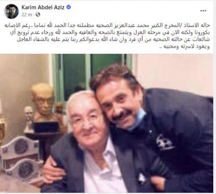 وكتب كريم، عبر حسابه على "فيسبوك": "حالة الأستاذ المخرج الكبير محمد عبدالعزيز الصحية مطمئنة جدا. الحمد لله تماما، رغم الإصابة بكورونا، ولكنه الآن في مرحلة العزل، ويتمتع بالصحة والعافية والحمد لله".