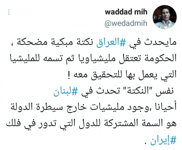 وقال في تغريدة على حسابه بموقع التدوين المصغر تويتر، اليوم إن: "ما يحدث في العراق نكتة مبكية مضحكة، الحكومة تعتقل مليشياويا ثم تسلمه للمليشيا التي يعمل بها للتحقيق معه".