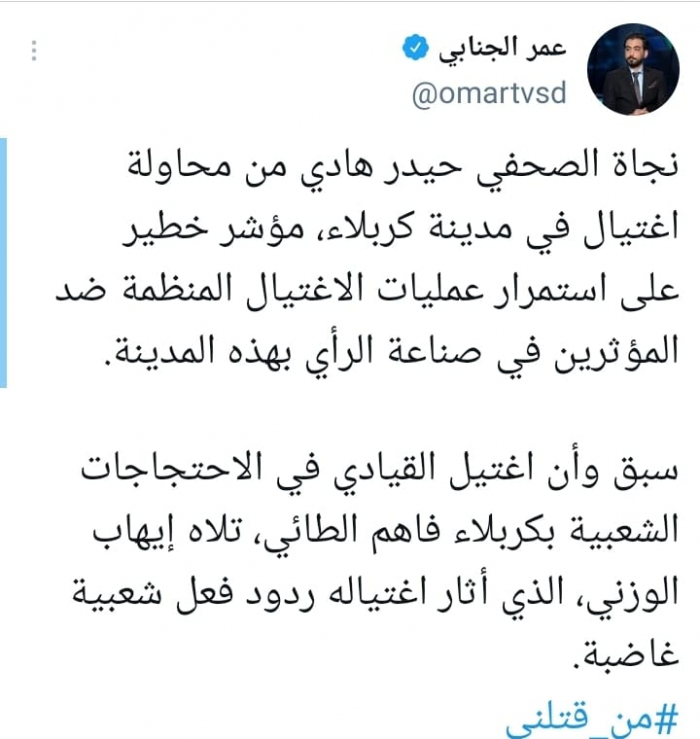 وأشار في تغريدة على حسابه بموقع التدوين المصغر تويتر، اليوم إلى أن: "نجاة الصحفي حيدر هادي من محاولة اغتيال في مدينة كربلاء، مؤشر خطير على استمرار عمليات الاغتيال المنظمة ضد المؤثرين في صناعة الرأي بهذه المدينة".