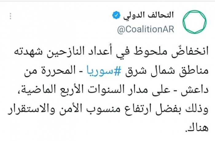 كشف التحالف الدولي للقضاء على تنظيم داعش الإرهابي، عن تراجع عدد النازحين من مناطق شمال سوريا المحررة من التنظيم.