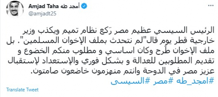 وقال في تغريدة عبر "تويتر" رصدها "المشهد العربي": "الرئيس السيسي عظيم مصر رَكع نظام تميم ويكذب وزير خارجية قطر يوم قال لم نتحدث بملف الإخوان المسلمين".