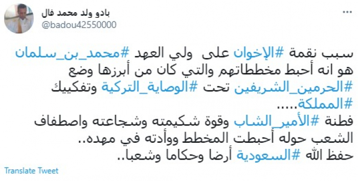 أشاد الكاتب الصحفي الموريتاني بادو ولد محمد فال، اليوم، بولي العهد السعودي الأمير محمد بن سلمان، مؤكدًا أنه أحبط مخططات تنظيم الإخوان.