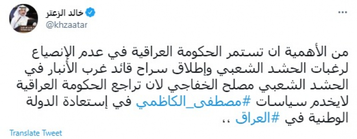 وقال في تغريدة عبر "تويتر" رصدها "المشهد العربي": "من الأهمية أن تستمر الحكومة العراقية في عدم الإنصياع لرغبات الحشد الشعبي وإطلاق سراح قائد غرب الأنبار في الحشد الشعبي مصلح الخفاجي لأن تراجع الحكومة العراقية لايخدم سياسات مصطفى الكاظمي في إستعادة الدولة الوطنية في العراق".