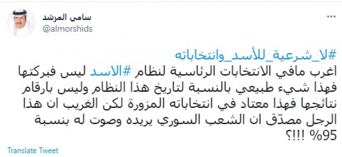 وقال في تغريدة عبر "تويتر" رصدها "المشهد العربي": "لا شرعية للأسد وانتخاباته أغرب ما في الانتخابات الرئاسية لنظام الأسد ليس فبركتها فهذا شيء طبيعي بالنسبة لتاريخ هذا النظام وليس بأرقام نتائجها فهذا معتاد في انتخاباته المزورة".