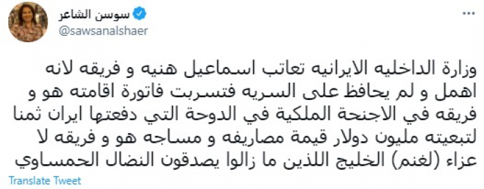 وقالت في تغريدة عبر "تويتر" رصدها "المشهد العربي": "وزارة الداخلية الإيرانية تعاتب إسماعيل هنيه وفريقه لأنه أهمل ولم يحافظ على السرية فتسربت فاتورة إقامته هو وفريقه في الاجنحة الملكية في الدوحة التي دفعتها إيران ثمنا لتبعيته مليون دولار قيمة مصاريفه ومساجه هو وفريقه لا عزاء (....) الخليج اللذين ما زالوا يصدقون النضال الحمساوي".