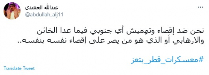 وقال في تغريدة عبر "تويتر" رصدها "المشهد العربي": "نحن ضد إقصاء وتهميش أي جنوبي فيما عدا الخائن والإرهابي أو الذي هو من يصر على إقصاء نفسه بنفسه".