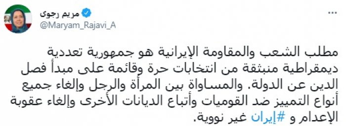 وقالت في تغريدة عبر "تويتر" رصدها "المشهد العربي": "مطلب الشعب والمقاومة الإيرانية هو جمهورية تعددية ديمقراطية منبثقة من انتخابات حرة وقائمة على مبدأ فصل الدين عن الدولة".