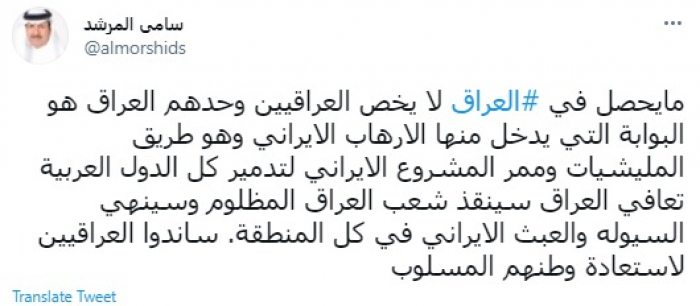 وقال في تغريدة عبر "تويتر" رصدها "المشهد العربي": "ما يحصل في العراق لا يخص العراقيين وحدهم العراق هو البوابة التي يدخل منها الإرهاب الايراني وهو طريق المليشيات وممر المشروع الإيراني لتدمير كل الدول العربية".