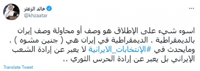 وكتب في تغريدة عبر "تويتر" رصدها "المشهد العربي": "أسوأ شيء على الإطلاق هو وصف أو محاولة وصف إيران بالديمقراطية، الديمقراطية في إيران هي (جنين مشوه)، وما يحدث في الانتخابات الإيرانية لا يعبر عن إرادة الشعب الإيراني بل يعبر عن إرادة الحرس الثوري".