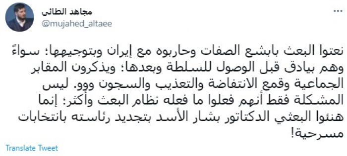وقال في تغريدة عبر "تويتر" رصدها "المشهد العربي": "نعتوا البعث بابشع الصفات وحاربوه مع إيران وبتوجيهها؛ سواءً وهم بيادق قبل الوصول للسلطة وبعدها؛ ويذكرون المقابر الجماعية وقمع الانتفاضة والتعذيب والسجون ووو. ليس المشكلة فقط أنهم فعلوا ما فعله نظام البعث وأكثر؛ إنما هنئوا البعثي الدكتاتور بشار الأسد بتجديد رئاسته بانتخابات مسرحية".