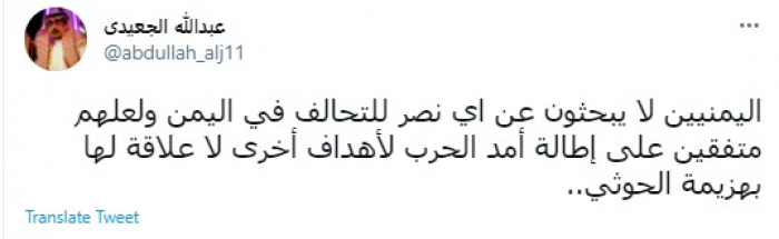 وكتب في تغريدة عبر "تويتر" رصدها "المشهد العربي": "اليمنيون لا يبحثون عن اي نصر للتحالف في اليمن ولعلهم متفقين على إطالة آمد الحرب لأهداف أخرى لا علاقة لها بهزيمة الحوثي".
