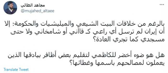 وقال في تغريدة عبر "تويتر" رصدها "المشهد العربي": "بالرغم من خلافات البيت الشيعي والميليشيات والحكومة؛ إلا أن إيران لم ترسل أي راعي كـ قاآني أو شامخاني ولا حتى مسجدي كما تجري العادة؟ هل هو ضوء أخضر للكاظمي لتقليم بعض أظافر بيادقها الذين يعملون لمصالحهم باسمها وغطائها؟".