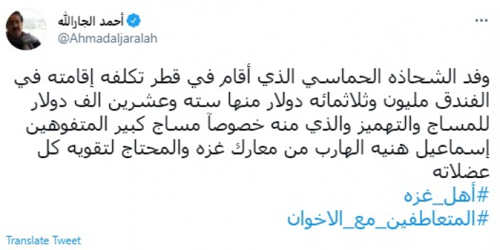 وقال في تغريدة عبر "تويتر" رصدها "المشهد العربي": "وفد الشحاذة الحماسي الذي أقام في قطر تكلفه إقامته في الفندق مليون وثلاثمائه دولار منها ستة وعشرين ألف دولار للمساج والذي منه خصوصآ مساج كبير المتفوهين إسماعيل هنيه الهارب من معارك غزة والمحتاج لتقوية كل عضلاته".