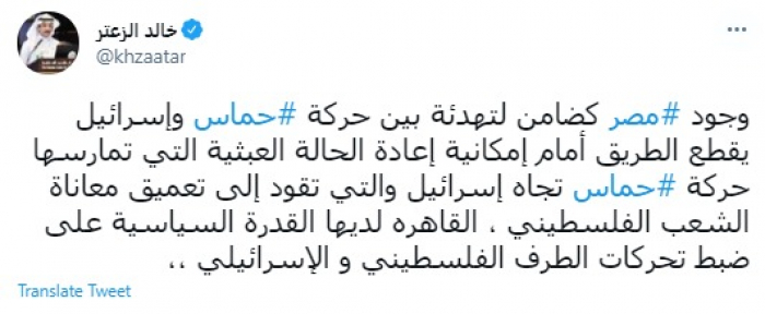 وقال في تغريدة عبر "تويتر" رصدها "المشهد العربي": "وجود مصر كضامن لتهدئة بين حركة حماس وإسرائيل يقطع الطريق أمام إمكانية إعادة الحالة العبثية التي تمارسها حركة حماس تجاه إسرائيل والتي تقود إلى تعميق معاناة الشعب الفلسطيني ، القاهره لديها القدرة السياسية على ضبط تحركات الطرف الفلسطيني والإسرائيلي".