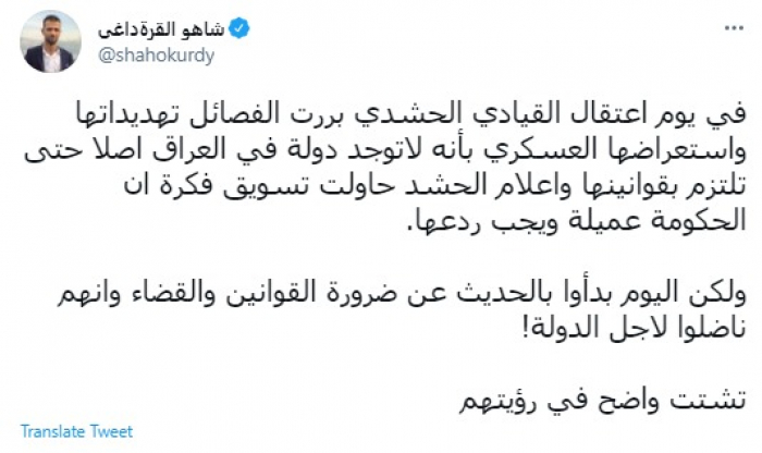 وكتب في تغريدة عبر "تويتر" رصدها "المشهد العربي": "في يوم اعتقال القيادي الحشدي بررت الفصائل تهديداتها واستعراضها العسكري بأنه لاتوجد دولة في العراق اصلا حتى تلتزم بقوانينها واعلام الحشد حاولت تسويق فكرة ان الحكومة عميلة ويجب ردعها".