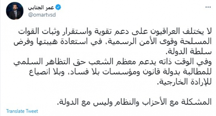 أكد الكاتب الصحفي العراقي عمر الجنابي، اليوم، أن الشعب العراقي يدعم إجراءات الحكومة في استعادة هيبة الدولة، مؤكدًا أن أزمة العراقيين مع الأحزاب والنظام وليس مع الدولة.