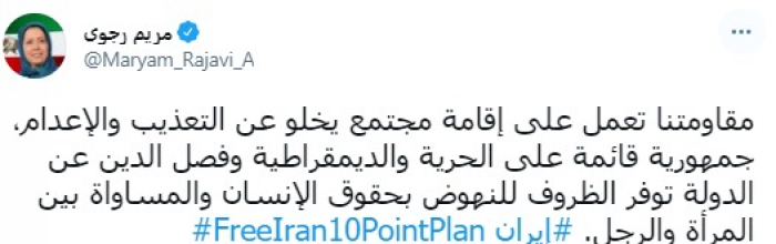 وقالت في تغريدة عبر "تويتر" رصدها "المشهد العربي": "مقاومتنا تعمل على إقامة مجتمع يخلو عن التعذيب والإعدام، جمهورية قائمة على الحرية والديمقراطية وفصل الدين عن الدولة توفر الظروف للنهوض بحقوق الإنسان والمساواة بين المرأة والرجل".